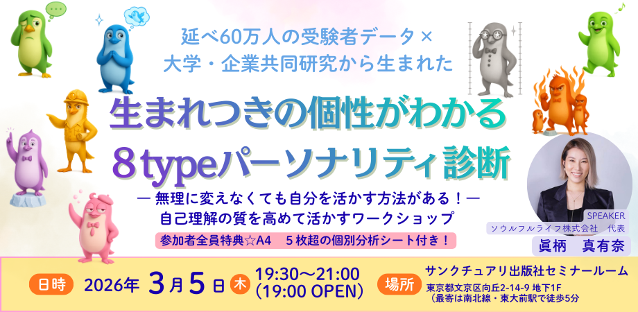 3月5日(木曜日)【A4・15枚超のあなたの分析結果をその場でプレゼント|通常6,000円の診断を今回だけ無償】生まれながらの8つの情動タイプから自分を知る講座 ―眞柄真有奈