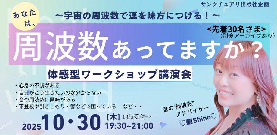 この特別なワークショップでは、音の周波数アドバイザー ♡癒Shino♡が、10年間の自身の苦悩や実践と研究から得た宇宙の法則を、体感型の講演会としてお伝えします。あなたの人生に真の変化をもたらす、音の持つ神秘的な力を一緒に体験してみませんか?