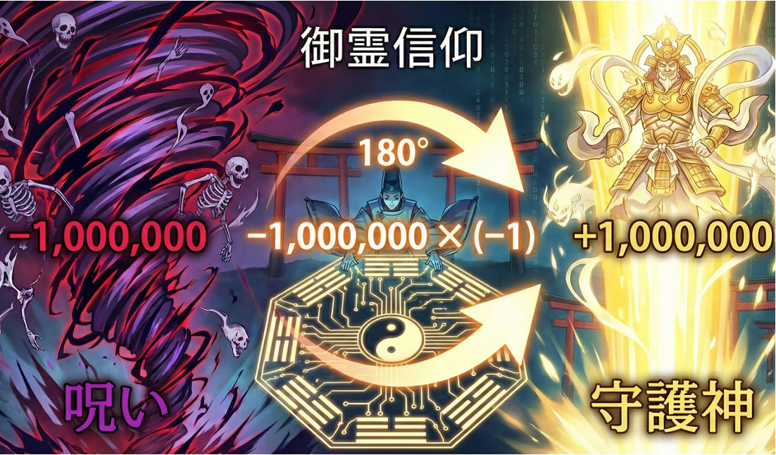 マイナス(呪い)に、もうひとつのマイナス(畏怖と崇敬)を掛け合わせることで、プラス(祝福)に転じさせる。呪術廻戦で言うところの「反転術式」です。